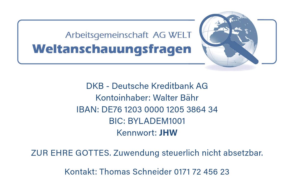 Hinweis: Auch zu anderen Themen sind AG WELT – Kurzinformationen auf Spendenbasis erhältlich. Sie eignen sich bestens zum Verteilen in Gemeinden und Hauskreisen. Bitte fragen Sie uns. Bestellen Sie auch unsere Quartalspublikation Brennpunkt Weltanschauung zur Aufklärung über Weltanschauungen und Ideologien unserer Zeit!