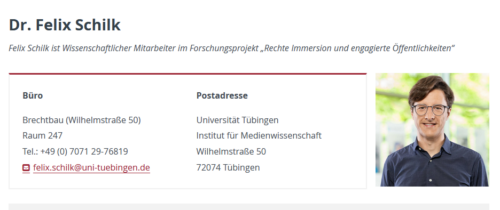 Schilk arbeitet am Institut für Medienwissenschaft der Universität Tübingen am „Forschungsprojekt: Rechte Immersion und engagierte Öffentlichkeiten“, das vom Bundesministerium für Forschung, Technologie und Raumfahrt mit Steuermitteln der Bürger gefördert wird. Darin geht es um die Vertiefung in rechtsextreme Inhalte und Ideologien, vor allem durch immersive Erfahrungen in sozialen Medien, die starke emotionale Wirkungen hervorrufen und politische Meinungen beeinflussen könnten.