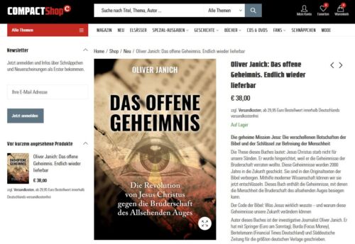 Das COMPACT-Magazin empfiehlt über seinen Shop das Buch von Oliver Janich mit dem Titel „Das offene Geheimnis – Die Revolution von Jesus Christus gegen die Bruderschaft des Allsehenden Auges“.