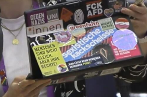 Während ihrer Fragestellung an den Rat der EKD hält Metz provokant die Klappe ihres Notebookes treffsicher in die Kamera, auf dem u.a. diese Texte zu lesen sind: „Gegen Nazis“, „*innen“, „FCK AFD“, „sexistische kackscheisse“, „Menschen sind nicht gleich. Aber ihre Rechte“, „greenfaith (grüner Glaube)“.