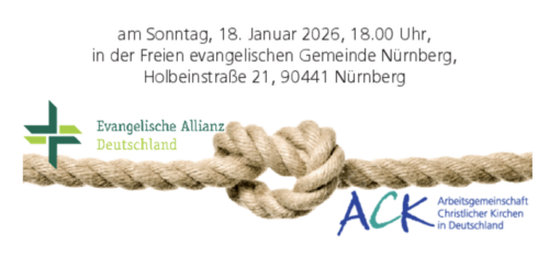 - „Am 18. Januar 2026 endet die Allianzgebetwoche und beginnt die Gebetswoche für die Einheit der Christen. An diesem Übergang feiern die ACK in Deutschland und die Evangelische Allianz in Deutschland in Nürnberg zum ersten Mal einen gemeinsamen Gottesdienst. Zum ersten Mal laden die ACK in Deutschland und die Evangelische Allianz in Deutschland zu einem gemeinsamen Gottesdienst ein. Dieser wird in Zusammenarbeit mit der regionalen ACK in Bayern und der lokalen ACK in Nürnberg sowie der Evangelischen Allianz in Nürnberg vorbereitet und durchgeführt. Er findet statt am Sonntag, 18. Januar 2026, 18 Uhr, in den Räumen der Freien evangelischen Gemeinde Nürnberg.“