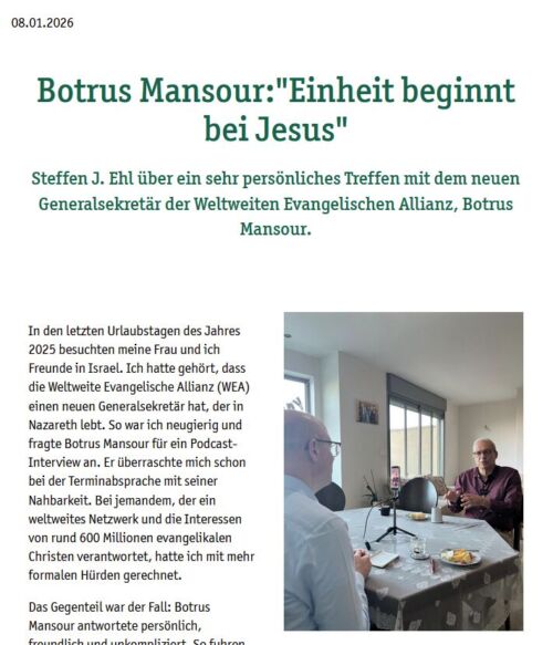 Wie idea und die Deutsche Evangelische Allianz (DEA) berichten, hat der IT-Manager Steffen J. Ehl den neuen Generalsekretär der weltweiten Evangelischen Allianz (WEA) Botrus Mansour Ende 2025 in Nazareth getroffen und mit ihm ein Gespräch geführt.